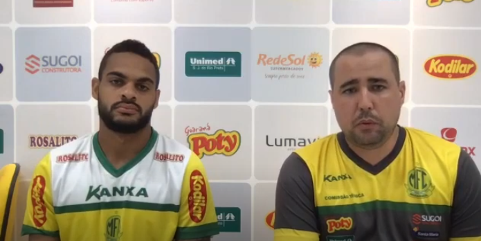 Técnico Ricardo Catalá e atacante Juninho, ambos do Mirassol FC, falam para a imprensa em coletiva realizada na tarde desta terça-feira no CT do Mirassol.