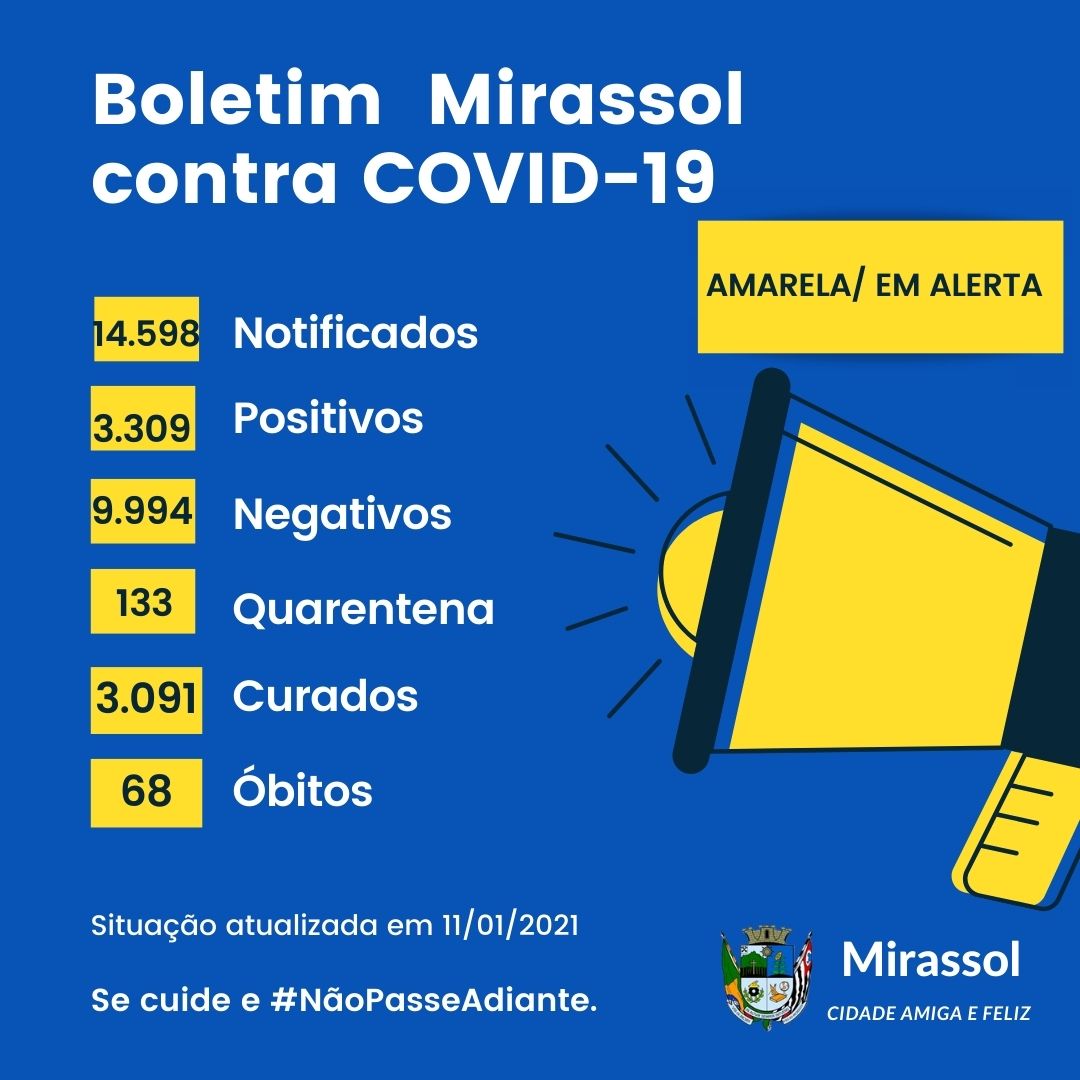 Mirassol registrou 15 novos casos de Covid-19 nas últimas 48 horas, conforme boletim divulgado nesta segunda-feira (11) pelo departamento de Saúde e da Vigilância Epidemiológica do município. Ao todo são 14.598 notificações, com 3.309 positivos, 9.994 negativos, 3.091 curados, 133 em quarentena e 68 óbitos.
