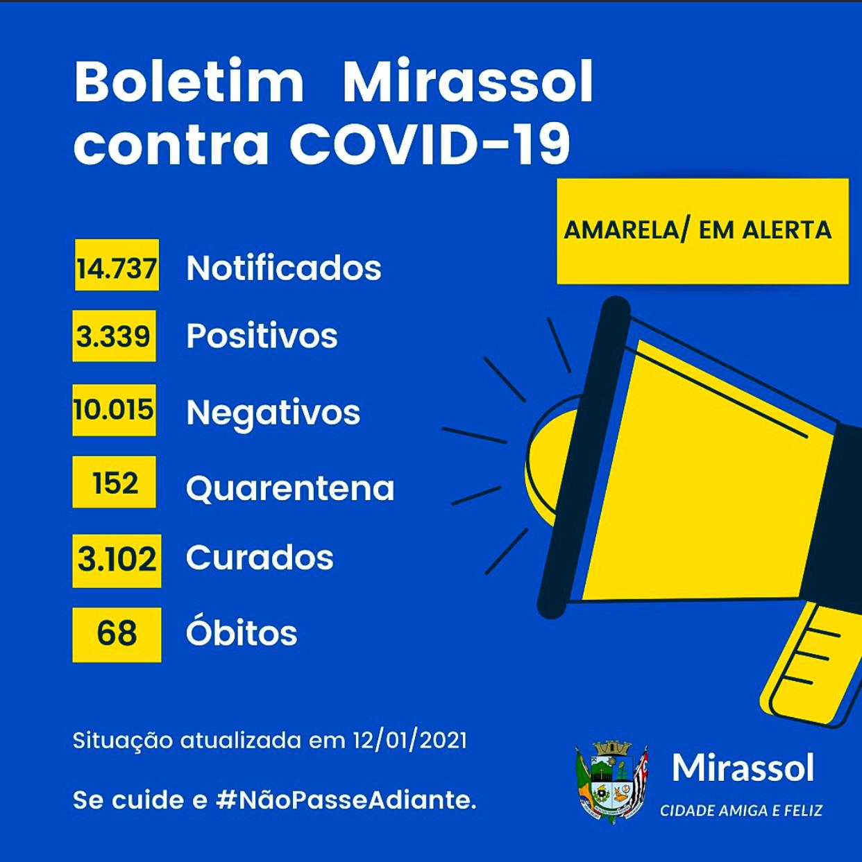 Mirassol registrou 30 novos casos de Covid-19, conforme boletim divulgado nesta terça-feira (12) pelo departamento de Saúde e da Vigilância Epidemiológica do município. Ao todo são 14.737 notificações, com 3.339 positivos, 10.015 negativos, 3.102 curados, 152 em quarentena e 68 óbitos.