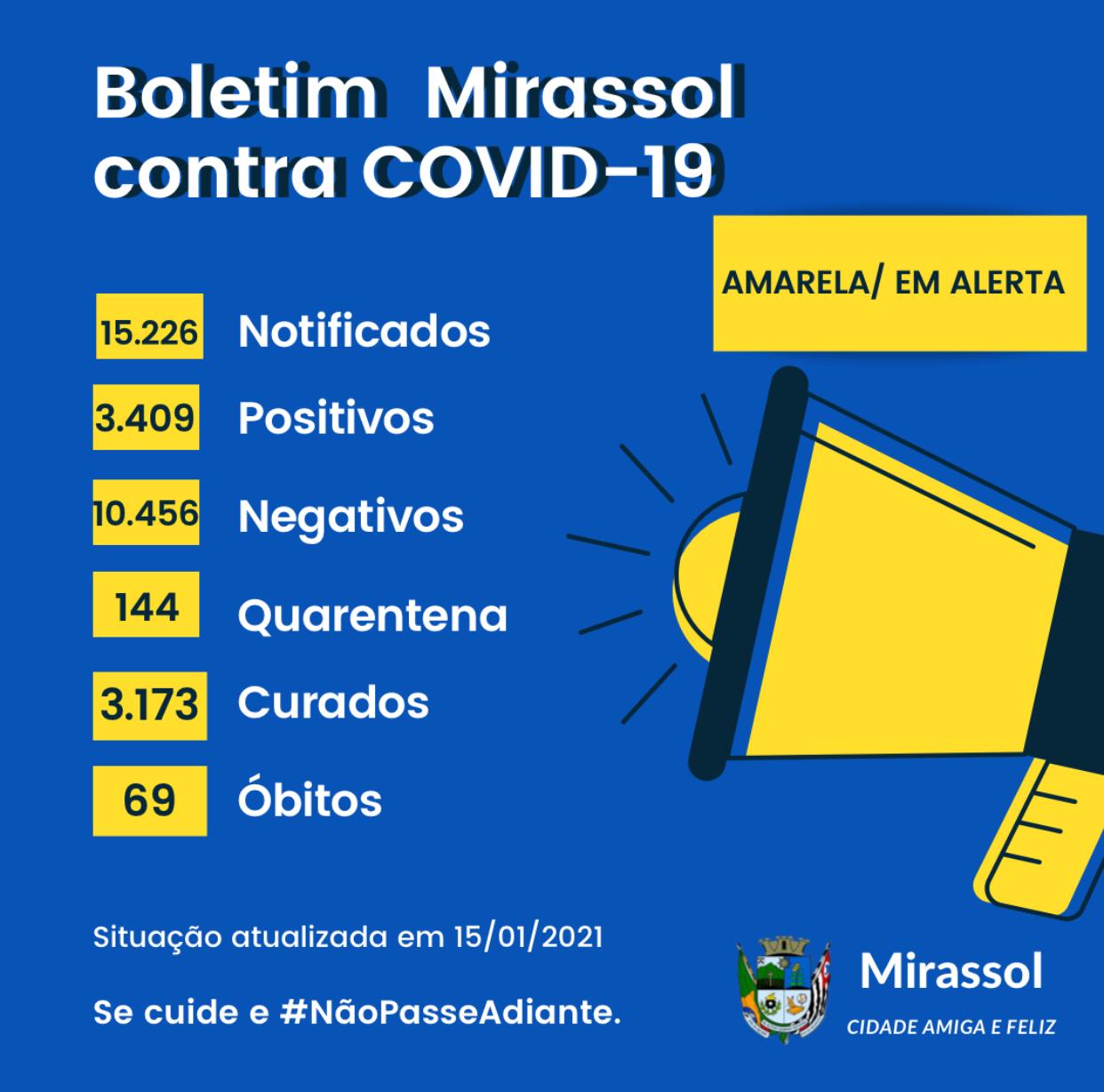 Mirassol registrou 30 novos casos de Covid-19, conforme boletim divulgado nesta sexta-feira (15) pelo departamento de Saúde e da Vigilância Epidemiológica do município. Ao todo são 15.226 notificações, com 3.409 positivos, 10.456 negativos, 3.173 curados, 150 em quarentena e 69 óbitos.