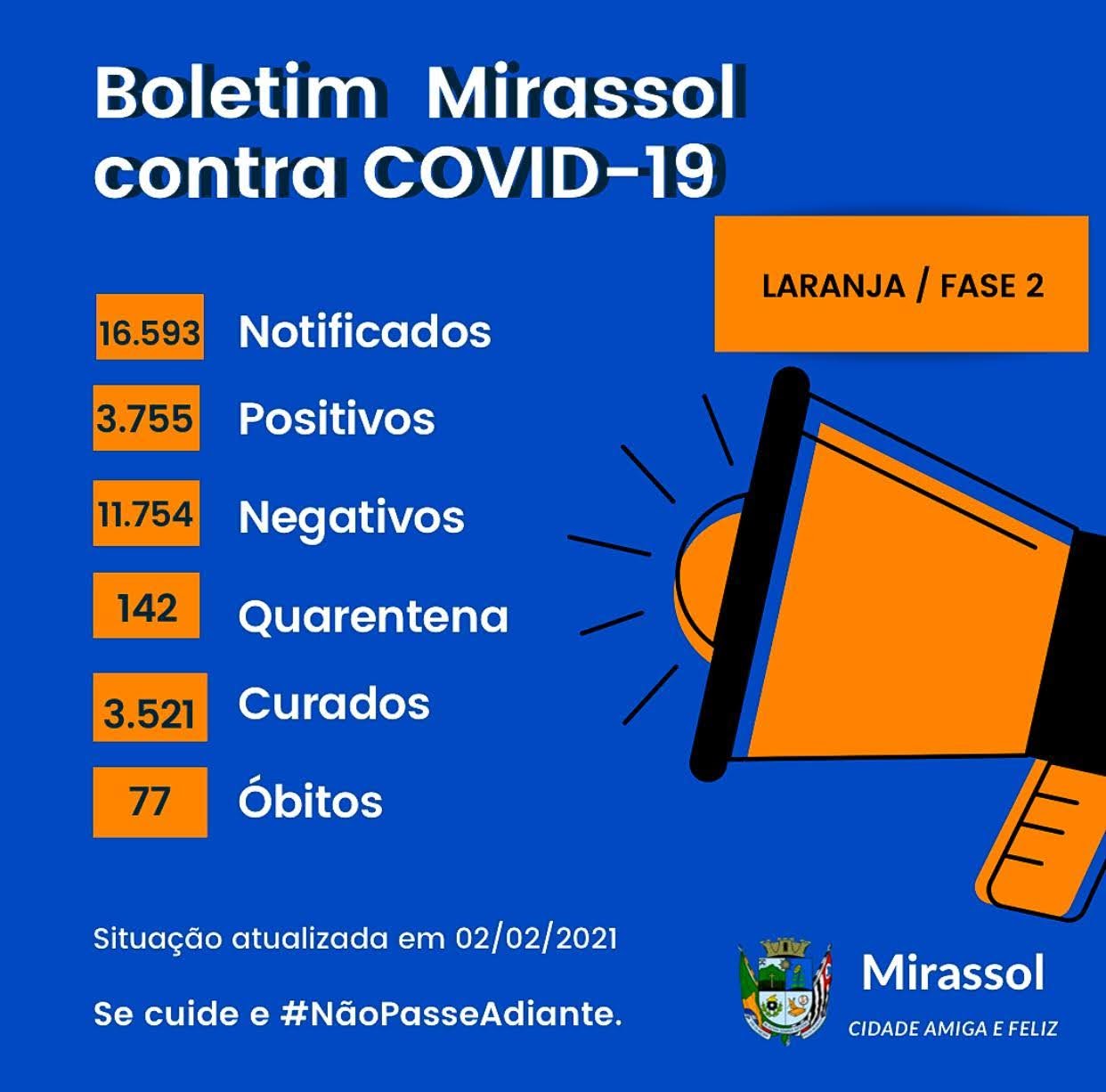 Mirassol registrou 14 novos casos de Covid-19, conforme boletim divulgado nesta terça-feira (02) pelo departamento de Saúde e da Vigilância Epidemiológica do município. Com isso, o município contabiliza 16.593 notificações, sendo 3.755 positivos, 11.754 negativos, 3.521 curados, 142 em quarentena e 77 óbitos.