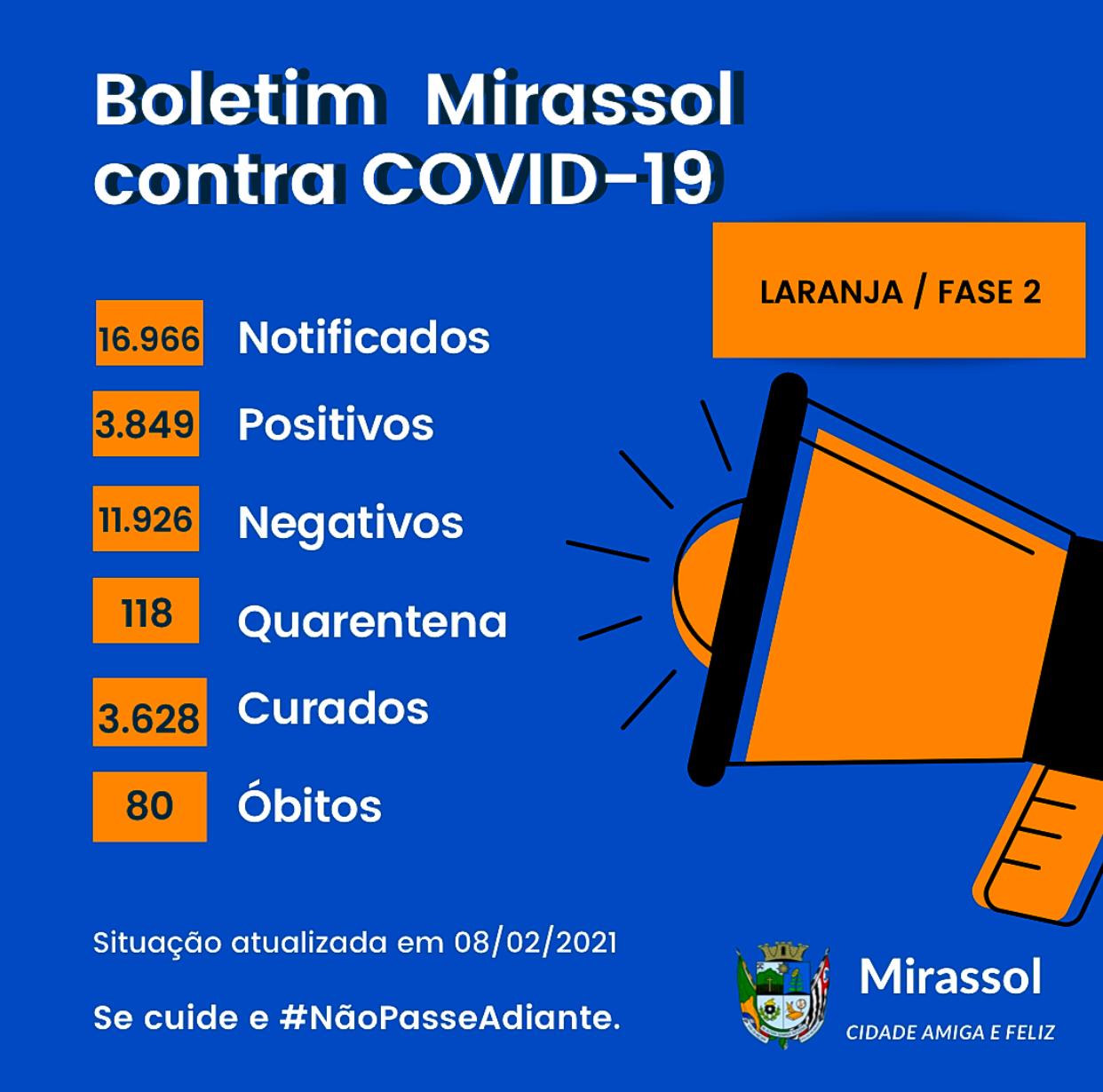 Mirassol registrou 13 novos casos de Covid-19, conforme boletim desta segunda-feira (08) pelo departamento de Saúde e da Vigilância Epidemiológica do município. Com isso, o município contabiliza 16.966 notificações, sendo 3.842 positivos, 11.926 negativos, 3.628 curados, 118 em quarentena e 80 óbitos.