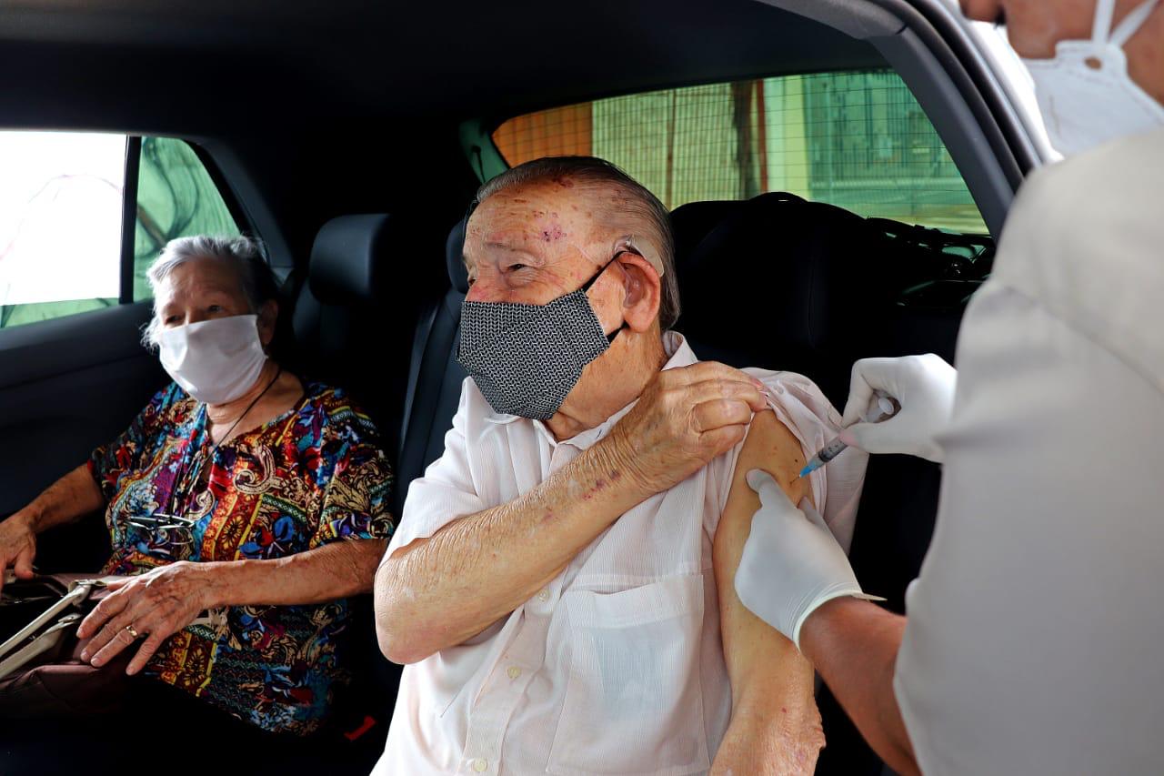 Foto: Deocides Silvério da Silva, 85 anos, recebeu a primeira dose sa vacina. (Imagem: Assessoria de Imprensa da PMM)