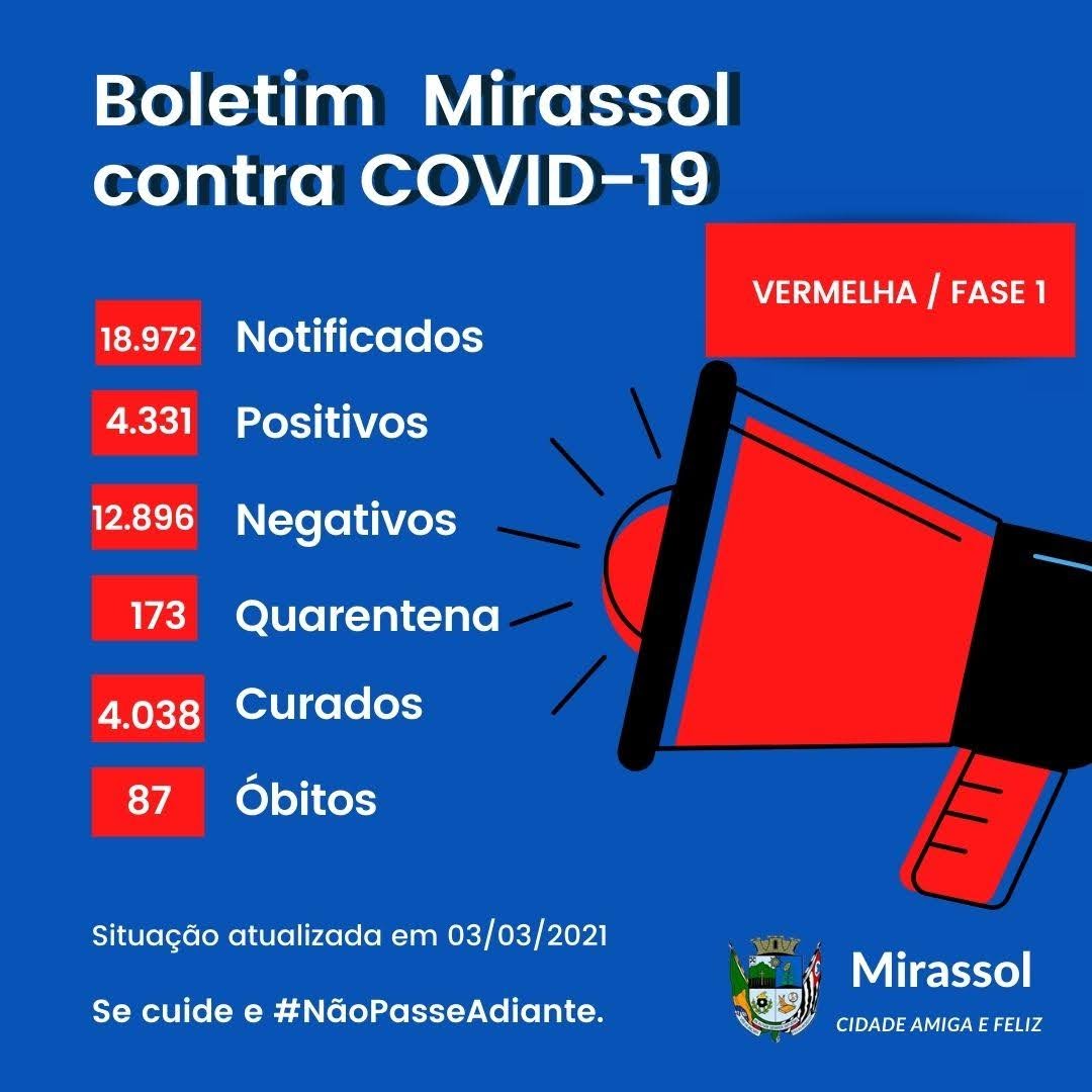 Mirassol registrou mais 19 casos e dois óbitos por covid-19, conforme boletim desta quarta-feira (03) do departamento de Saúde e da Vigilância Epidemiológica do município. As vítimas são uma idosa de 81 anos, que tinha hipertensão arterial sistêmica e ex-tabagista, e um idoso de 72 anos, que tinha doenças cardíacas crônicas. Ela veio a óbito na última segunda-feira (1º) e ele na terça-feira (02). Com isso, o município chega a 87 mortes pela doença, com 18.972 notificações, sendo 4.331 positivos, 12.896 negativos, 4.038 curados e 173 em quarentena.
