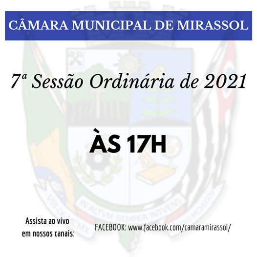 Os vereadores da Câmara de Mirassol reúnem-se hoje, às 17h, para discutir e votar a pauta da 7ª Sessão Ordinária. A sessão está sendo antecipada para respeitar o Plano São Paulo, do governo estadual, que prevê o toque de restrição das 20h às 5h. A 7ª Sessão Ordinária será transmitida ao vivo pela página da Câmara de Mirassol no Facebook. A participação presencial dos munícipes não está sendo permitida.