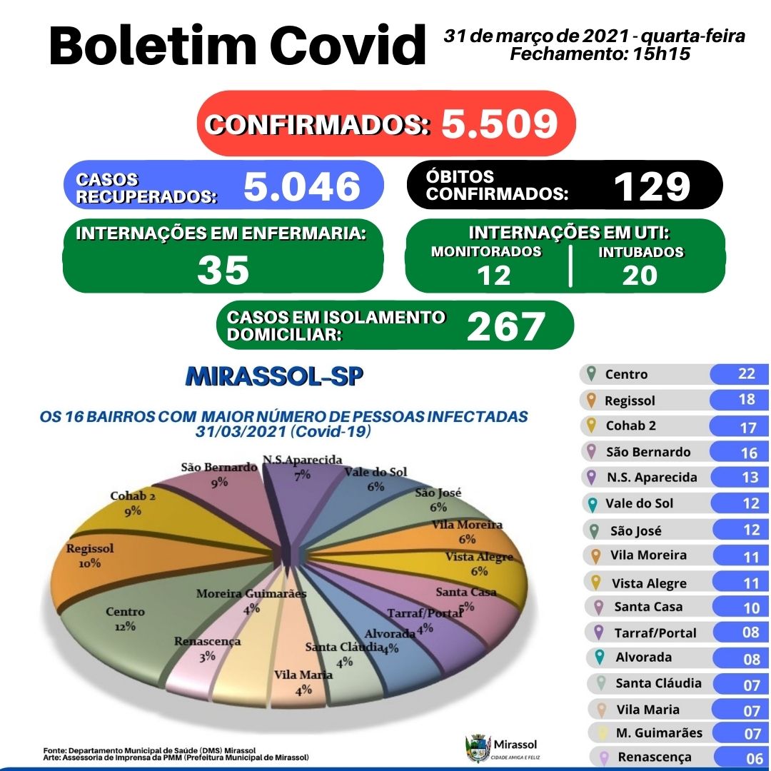 Mirassol registrou 94 novos casos positivos e um óbito por covid-19, conforme boletim das 15h15 desta quarta-feira (31) do departamento de Saúde e da Vigilância Epidemiológica do município. A vítima é uma mulher de 53 anos. Ela estava internada na UPA. O número de novos casos positivos registrados representa um recorde em 24 horas. Com isso, o município chegou aos 129 óbitos e contabiliza 22.829 notificações, sendo 5.509 confirmados (positivos), 14.708 negativos, 5.046 recuperados e 267 casos em isolamento domiciliar.