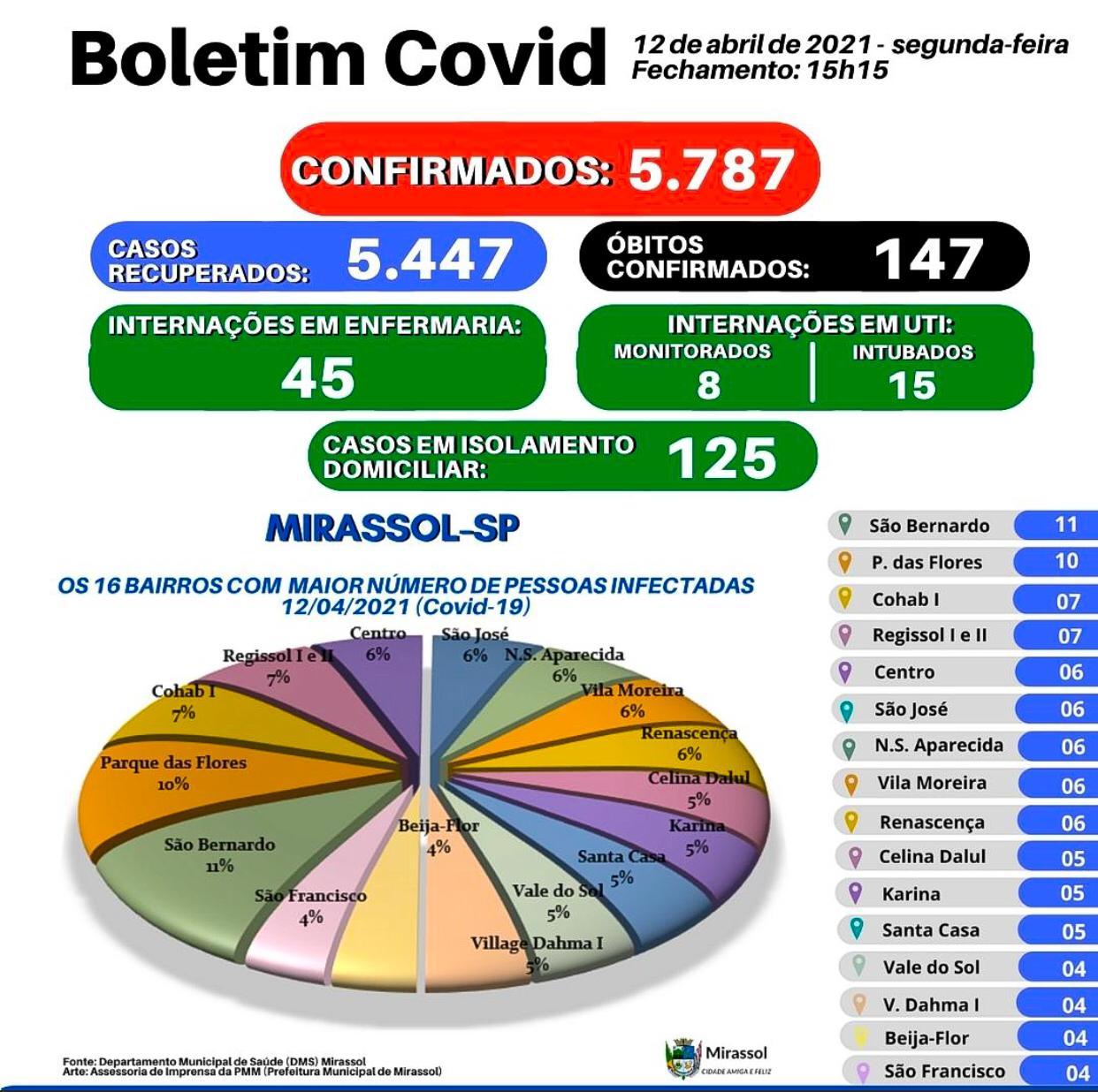 Mirassol registrou 29 novos casos positivos e dois óbitos pelo Novo Coronavírus, conforme boletim das 15h15 desta segunda-feira (12) do Departamento Municipal de Saúde (DMS) e da Vigilância Epidemiológica do município. Entre as vítimas está uma mulher de 44 anos, que estava internada no Hospital de Base desde o dia 18 de março e veio a óbito no dia 2 de abril. A outra vítima é um homem de 61 anos. Ele foi internado no HB no dia 13 de março e faleceu no último domingo (11). Com isso, o município chega a 147 óbitos e contabiliza 23.850 notificações, sendo 5.787 confirmados (positivos), 15.267 negativos, 5.447 recuperados e 125 casos em isolamento domiciliar.