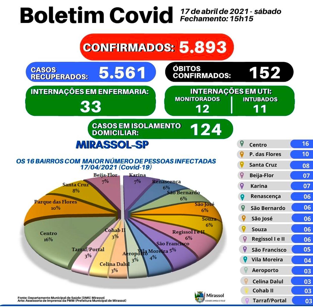 O Centro voltou a aparecer e de forma isolada no topo da lista dos 16 bairros com o maior número de pessoas infectadas pela Covid-19 (casos notificados) e que cumprem quarentena em casa. Os números auxiliam a Prefeitura de Mirassol a ampliar o trabalho de conscientização por meio de campanhas sobre os cuidados que a população deve ter para não contrair o vírus durante a pandemia. O Centro está no topo, com 16 pessoas em recuperação. Na sequência, está o Parque das Flores, com 10 pessoas; Beija-Flor e Karina 7; Renascença, São Bernardo, São José, Souza e Regissol I e II, com seis pessoas cada; São Francisco 5; Vila Moreira, Aeroporto, Celina Dalul, Cohab II e Tarraf/Portal, com três pessoas cada.