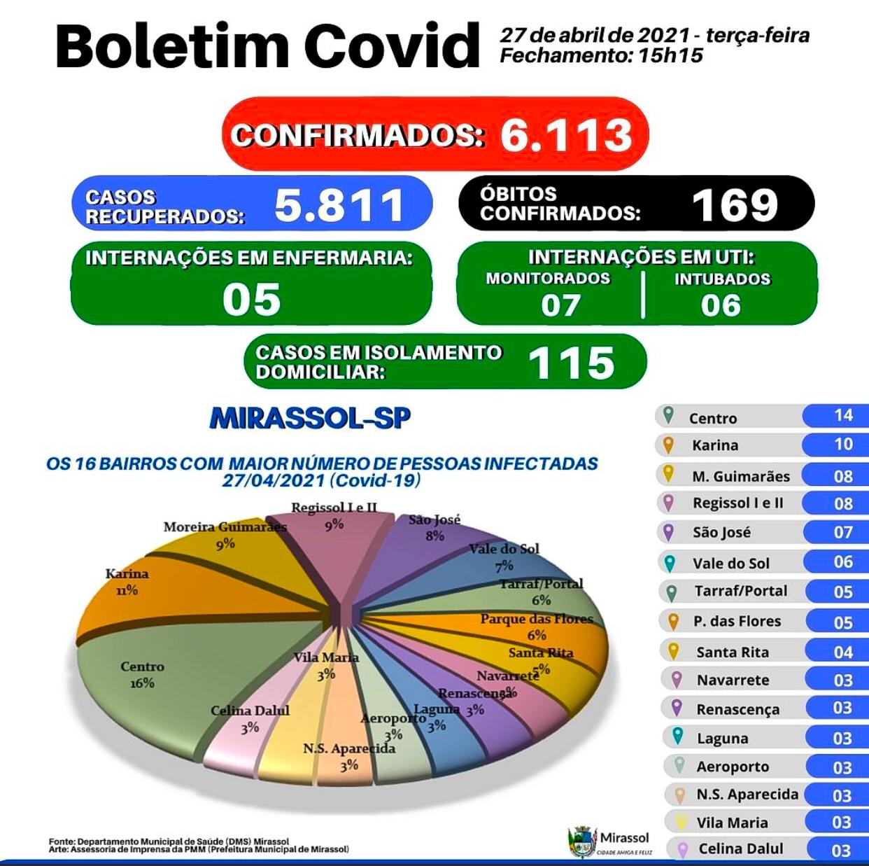 Mirassol registrou nove casos positivos e cinco óbitos pelo novo coronavírus, conforme boletim das 15h15 desta terça-feira (27) do Departamento Municipal de Saúde (DMS) e da Vigilância Epidemiológica do município. Entre as vítimas está dois homens e três mulheres (ver mais detalhes abaixo). Com isso, o município chega a 169 óbitos e contabiliza 25.083 notificações, com 6.113 casos confirmados (positivos), 16.697 negativos, 5.811 recuperados e 115 casos em isolamento domiciliar.