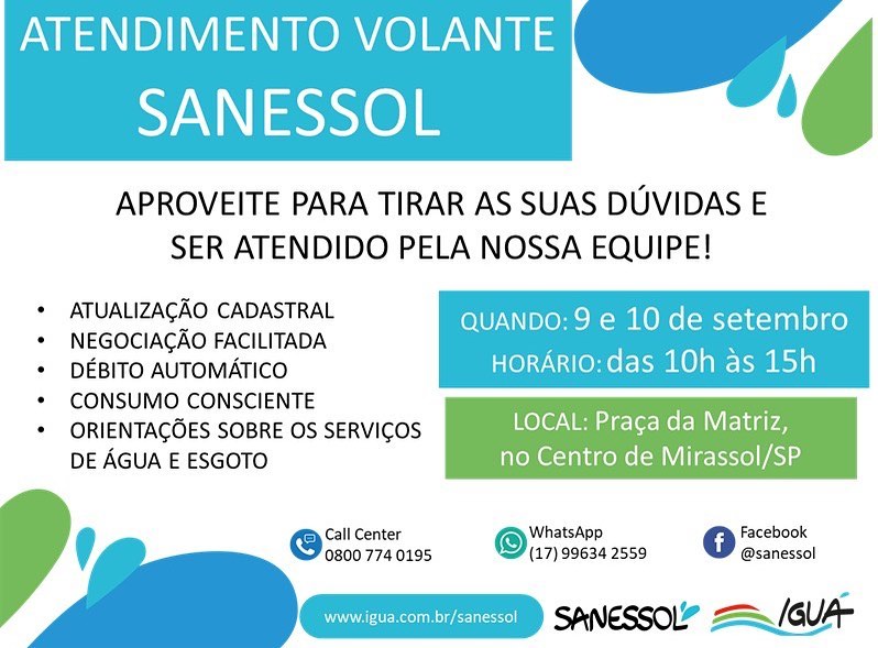 A Sanessol, empresa responsável pelo serviço de água e esgoto de Mirassol, está antendendo a população para orientações de uma série de serviços. E é tudo gratuito. Para saber mais, assista o vídeo abaixo, que foi registrado no programa TS Notícias desta quinta-feira (9).
