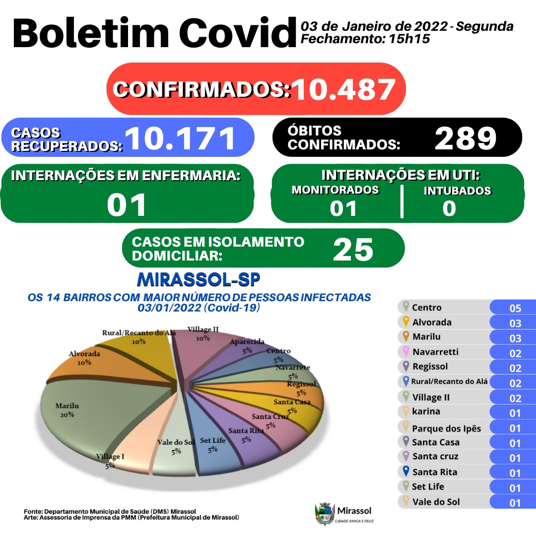 Mirassol registrou 16 casos positivos de Covid-19 conforme o boletim das 15h15 desta segunda-feira (03) do Departamento Municipal de Saúde (DMS) e da Vigilância Epidemiológica. Por outro lado, o município completa um mês sem óbitos pelo novo coronavírus. A última morte foi em 3 de dezembro (um homem de 77 anos). Com isso, Mirassol, contabiliza 43.752 notificações, 10.487 casos confirmados (positivos), 29.998 negativos, 10.171 recuperados, 25 pessoas em recuperação domiciliar e 289 óbitos.