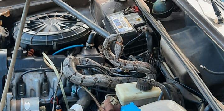 Um motorista encontrou uma cobra da espécie jiboia no compartimento do motor do carro na manhã de quarta-feira, 22. O caso aconteceu no bairro Cohab VII, em Potirendaba.