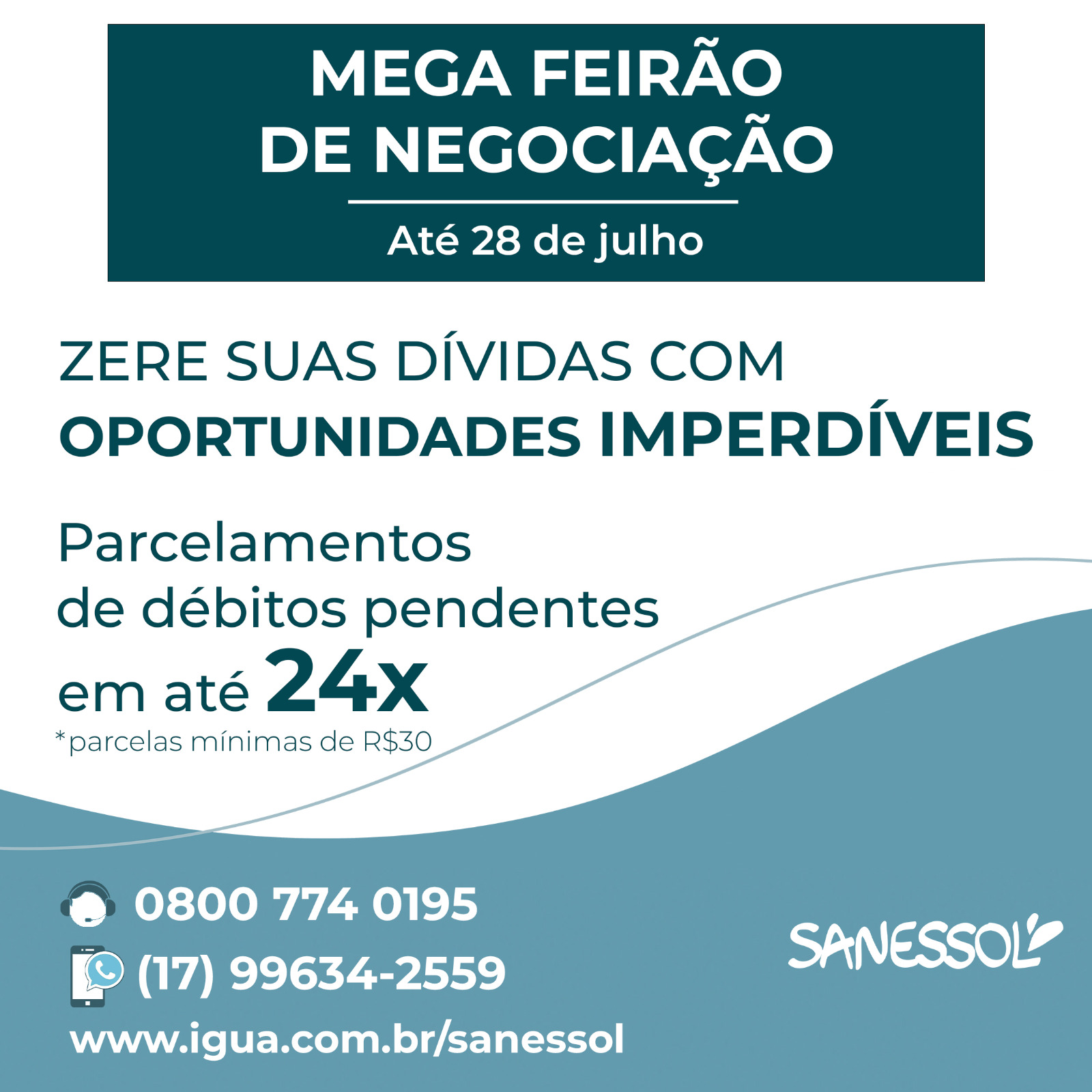 Os interessados em participar do Mega Feirão, é só entrar em contato pelos canais de atendimento ao cliente ou acessar o site www.igua.com.br/sanessol.